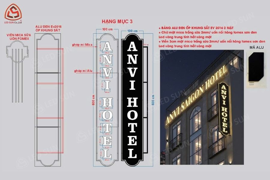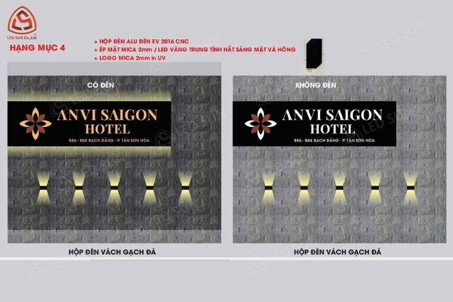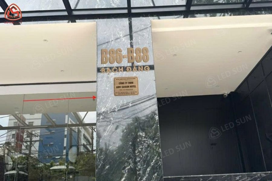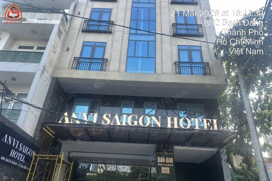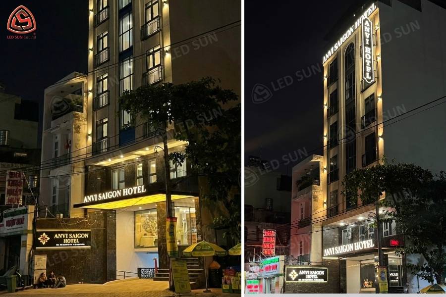 Hệ thống bảng hiệu sau khi hoàn thiện mang lại diện mạo chuyên nghiệp và nổi bật cho khách sạn. Các chi tiết thi công được thực hiện chỉn chu và đúng yêu cầu.