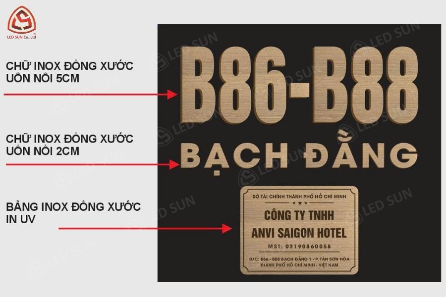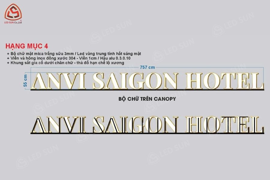 Led Sun triển khai hệ thống chữ nổi inox vàng gương kết hợp mica phát sáng, bố trí tại nhiều vị trí như ban công sân thượng, canopy và mặt tiền.