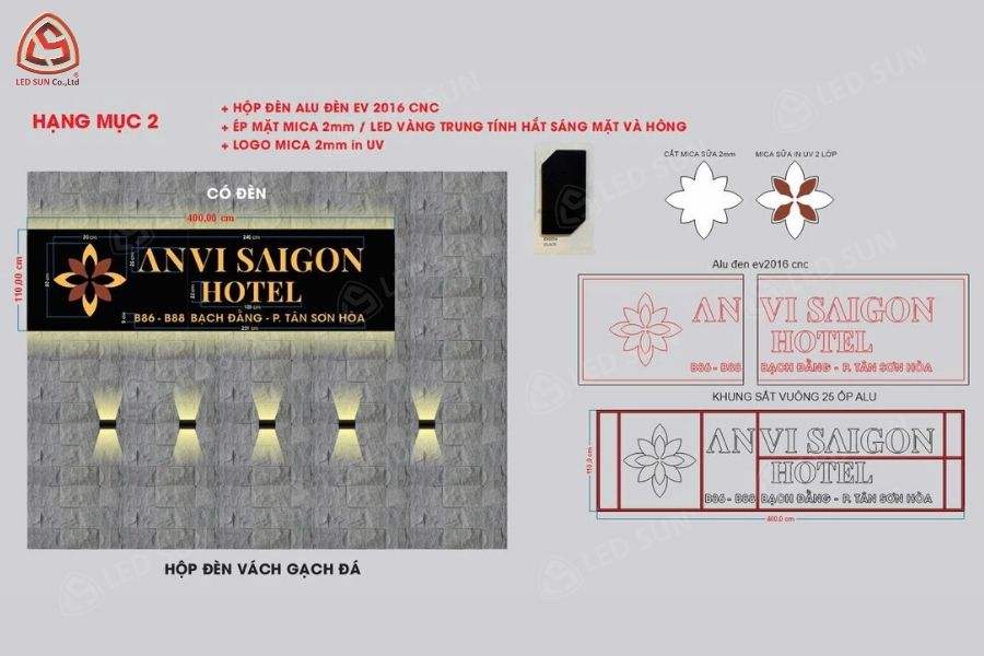 Led Sun thực hiện thiết kế, sản xuất và thi công bảng hiệu chữ nổi và nhận diện thương hiệu cho An Vi Hotel. Dự án bao gồm các hạng mục chữ nổi trên cao, bảng hiệu canopy, hộp đèn mặt tiền và hệ thống bảng chỉ dẫn nội bộ.