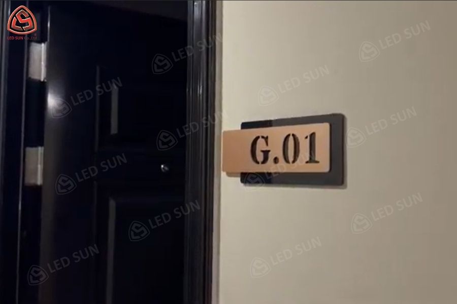 Hệ thống bảng hiệu sử dụng vật liệu inox vàng gương kết hợp LED ánh sáng 4000K, mang lại hiệu ứng sang trọng và đồng bộ với kiến trúc khách sạn.