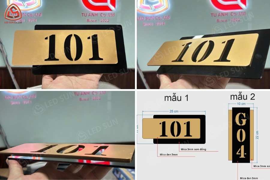 Vật liệu sử dụng: Inox 304 vàng gương, mica, alu, fomex, khung sắt