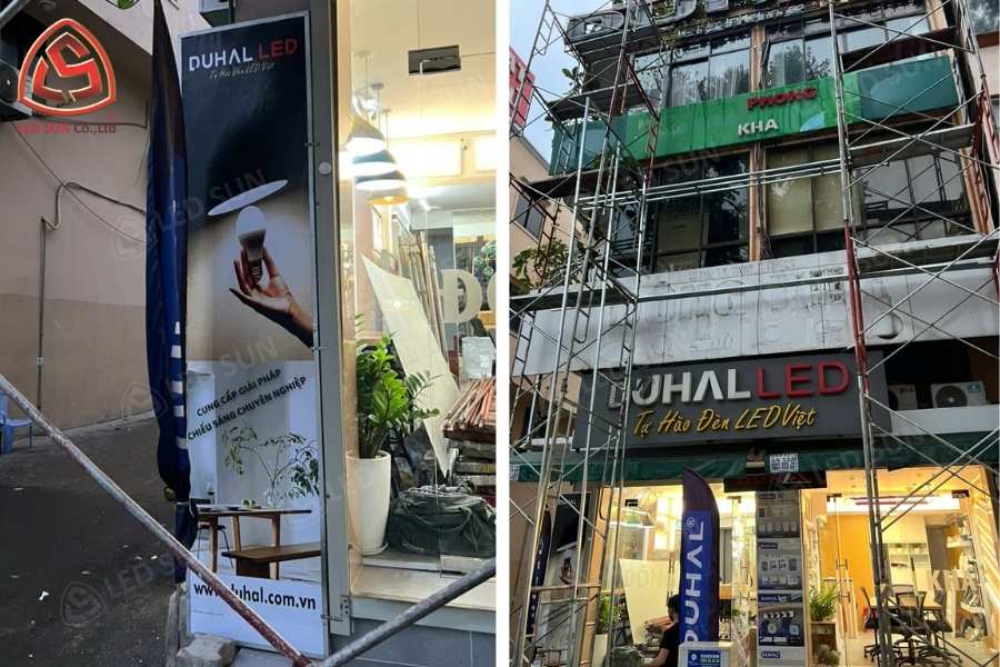 Led Sun thực hiện sản xuất và lắp đặt hệ thống bảng hiệu mặt tiền cho công ty phân phối đèn và thiết bị điện Duhal. Công trình bao gồm nhiều hạng mục bảng hiệu quảng cáo như bảng hiệu chữ nổi mica, bảng hiệu căng bạt khung sắt và bảng chữ nổi trên lam nhôm.