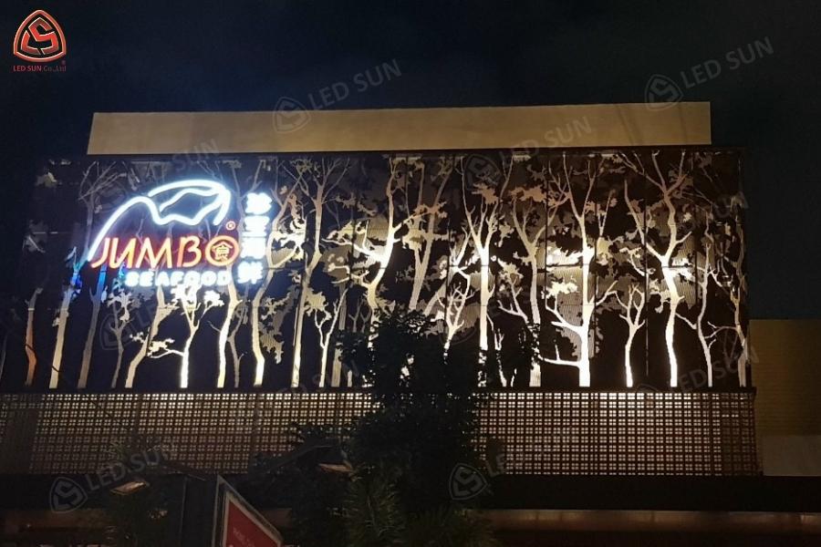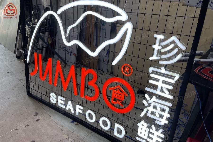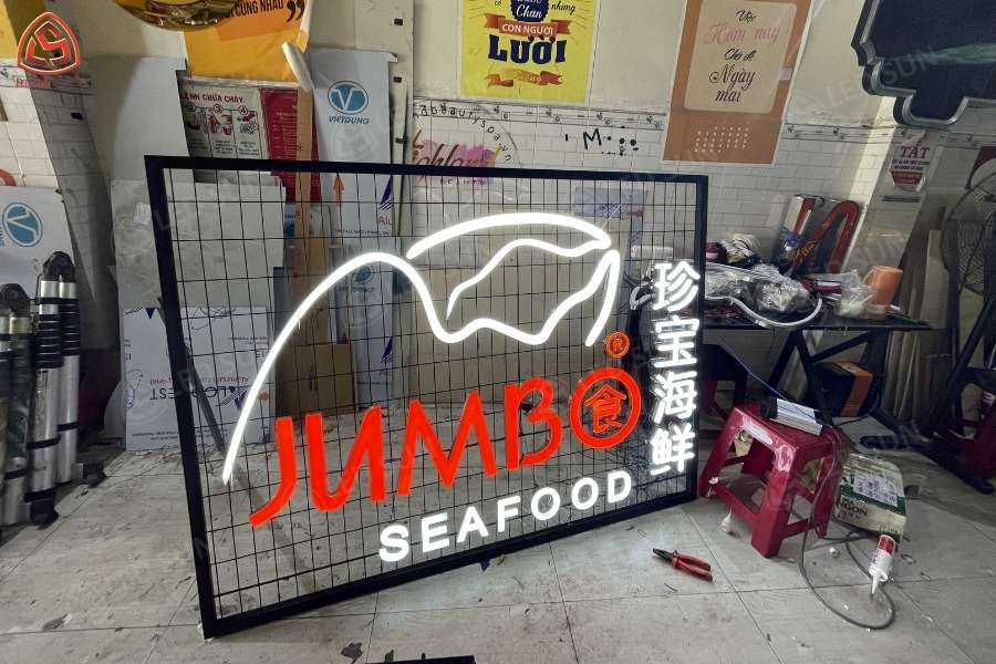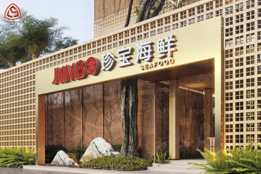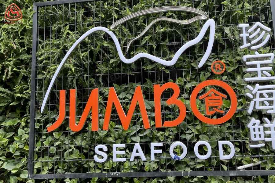 Led Sun thực hiện thiết kế, sản xuất và thi công hệ thống bảng hiệu và trang trí nội thất cho nhà hàng Jumbo Seafood Vietnam. Công trình bao gồm bảng hiệu chữ nổi inox phát sáng tại mặt tiền, hệ thống logo thương hiệu và các hạng mục trang trí nội thất bên trong nhà hàng.