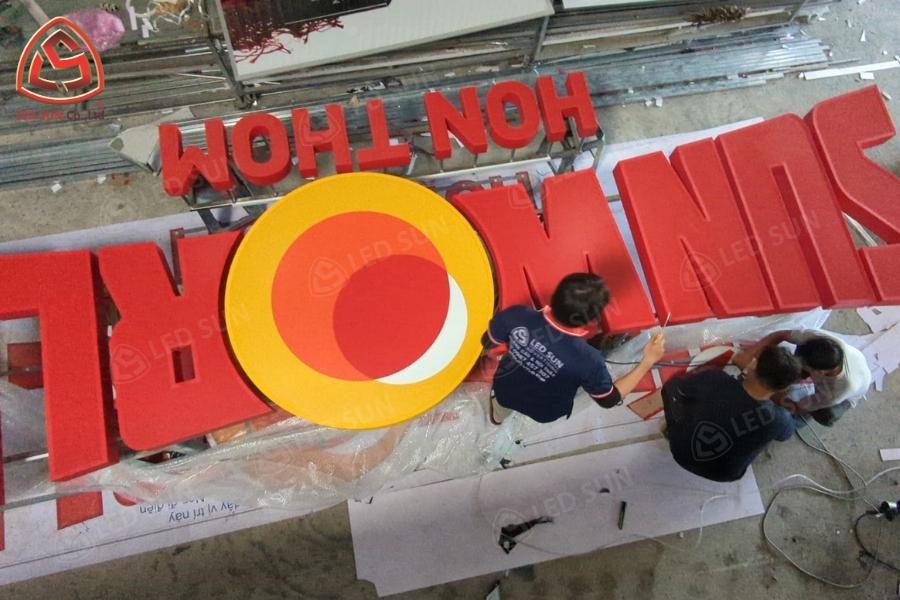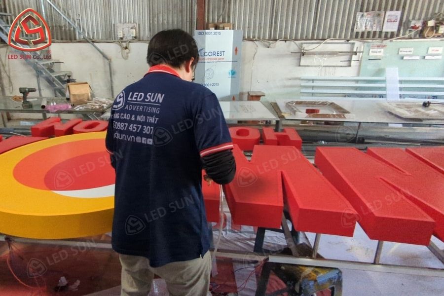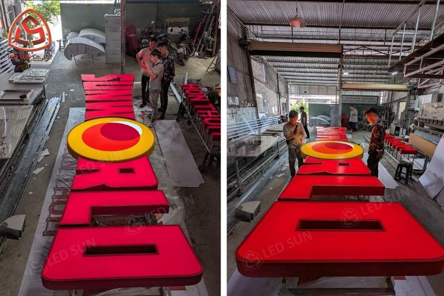 Quá trình sản xuất và thi công được thực hiện theo từng giai đoạn để đảm bảo độ chính xác của kích thước chữ và tính ổn định khi lắp đặt.