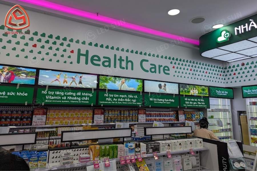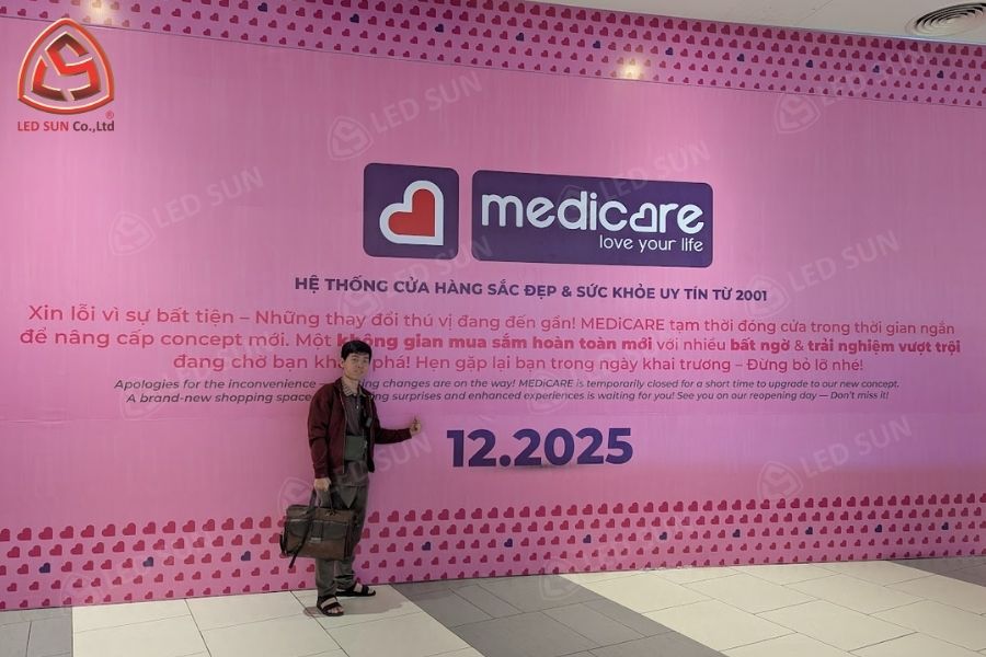 Sau khi hoàn thiện, gian hàng Medicare tại Aeon Tân Phú có hệ thống hộp đèn và bảng hiệu đồng bộ, giúp không gian bán lẻ trở nên nổi bật và dễ nhận diện. Các bảng thông tin và hình ảnh sản phẩm được bố trí hợp lý, hỗ trợ khách hàng dễ dàng tìm kiếm sản phẩm.