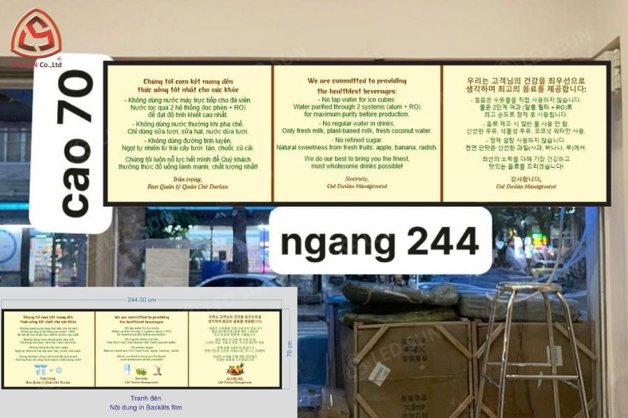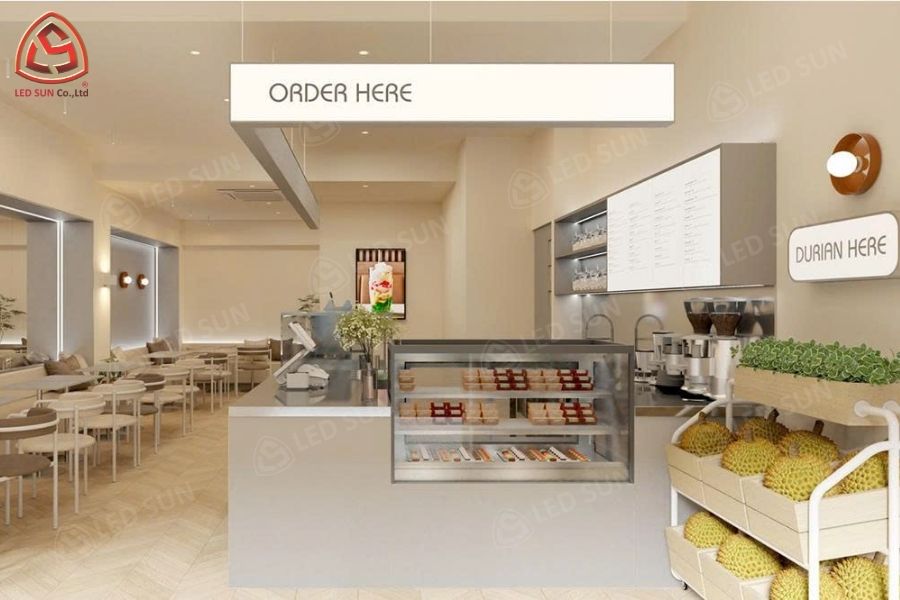 Các hộp đèn được bố trí ở nhiều vị trí khác nhau như mặt tiền, quầy order và tường trang trí.
