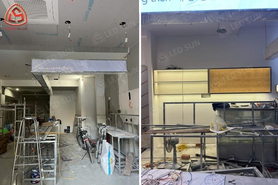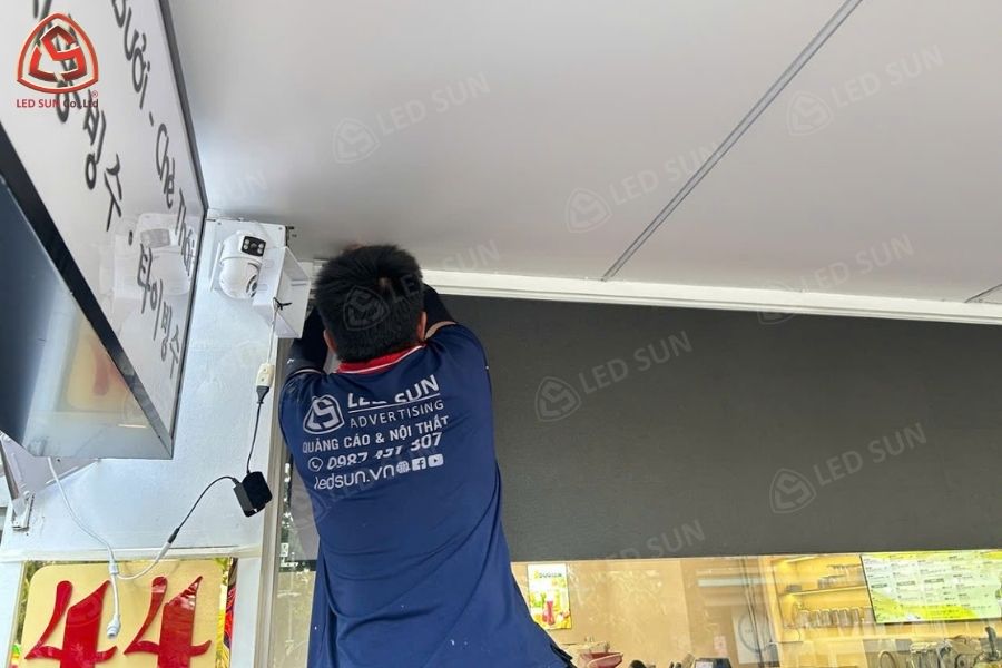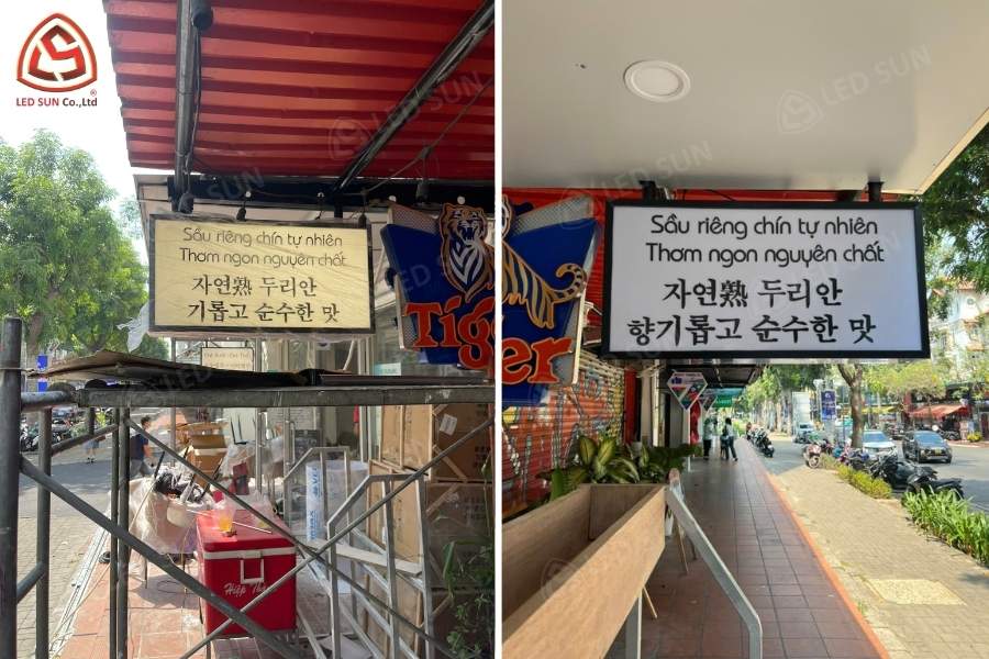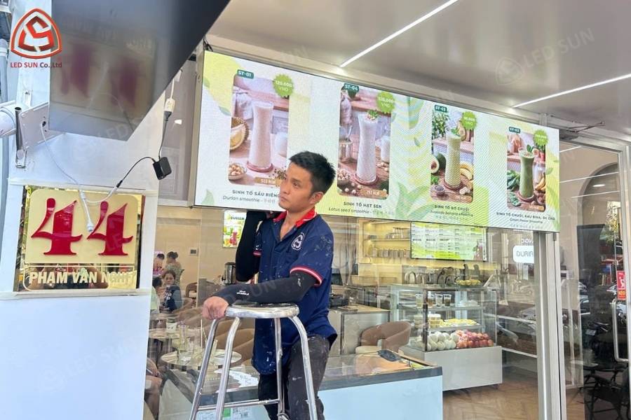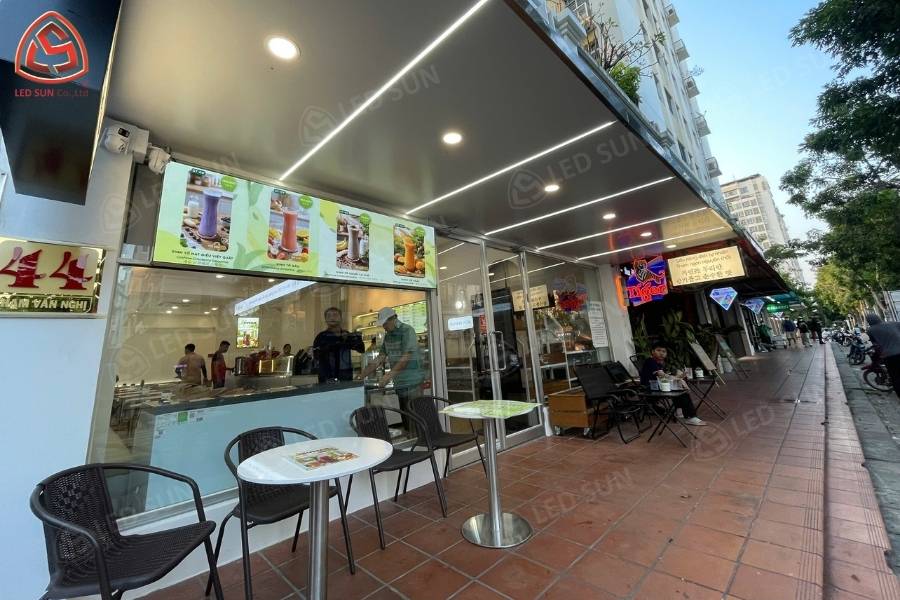 Led Sun triển khai thi công hệ thống bảng hiệu mặt tiền kết hợp hộp đèn quảng cáo và màn hình LED đặt trước quán.