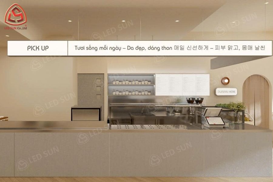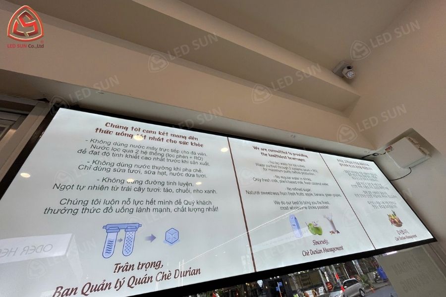 Màn hình LED được lắp đặt dưới biển hiệu lớn nhằm hiển thị nội dung sản phẩm và chương trình khuyến mãi.