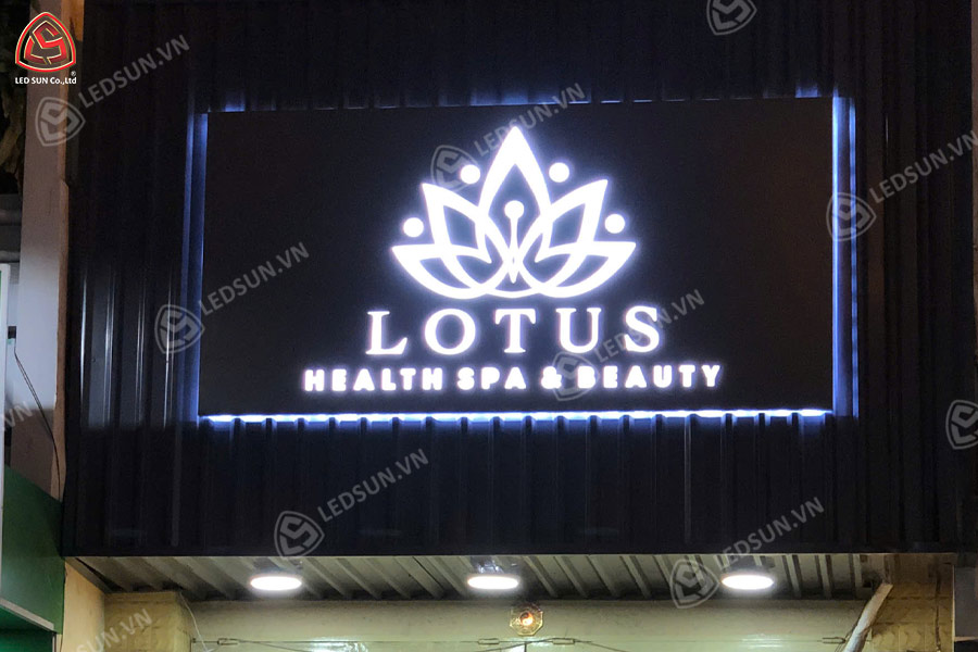 Lotus Health Spa & Beauty – Phường Xuân Hoà, TP. HCM Led Sun thi công bảng hiệu hộp đèn alu cắt CNC theo hình logo thương hiệu, phần mặt ốp mica âm bản được xử lý cẩn thận để ánh sáng xuyên qua đúng điểm nhấn. Thiết kế này tạo nên sự khác biệt so với các bảng hiệu truyền thống – vừa nghệ thuật, vừa tinh tế. Đây là giải pháp lý tưởng cho các spa kết hợp chăm sóc sức khỏe và làm đẹp, đề cao sự thư giãn và chuẩn mực thẩm mỹ cao cấp.