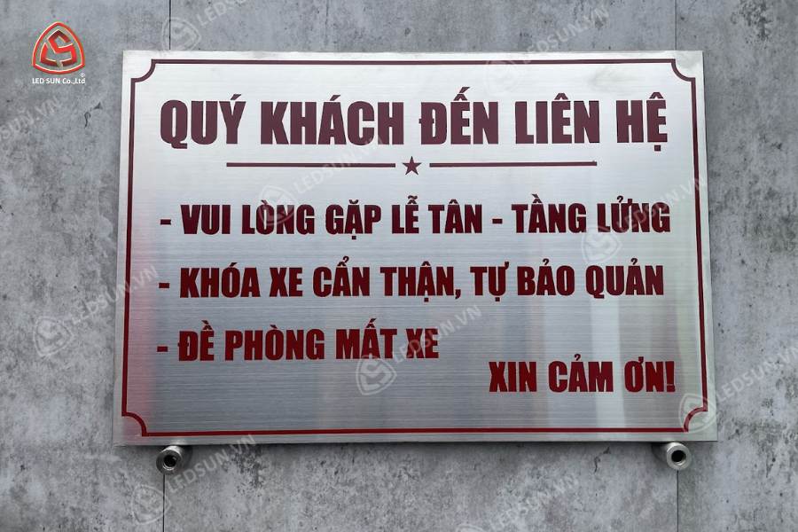 Bảng inox ăn mòn là một loại biển hiệu được làm từ tấm inox (thép không gỉ) bằng phương pháp sử dụng hóa chất đặc biệt để “ăn mòn” bề mặt kim loại, tạo ra nội dung (chữ, logo, hoa văn) có độ sâu nhất định. Phần nội dung sau đó được sơn màu theo thiết kế, tạo nên một sản phẩm bền đẹp và sang trọng.