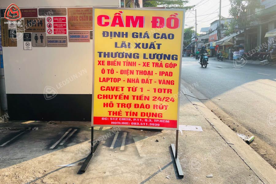 Biển bạt 2 mặt có chân là một loại biển quảng cáo phổ biến, thường được sử dụng trước các cửa hàng, quán ăn, tiệm tóc, tiệm tạp hóa,… với mục đích thu hút sự chú ý từ cả hai hướng người đi đường.