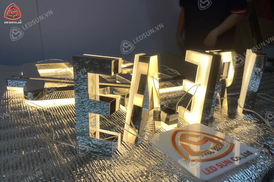 Chữ inox trắng gương có độ bóng cao, mang lại vẻ thanh lịch, hiện đại. Khi kết hợp với ánh sáng LED, mẫu chữ này giúp bảng hiệu trở nên nổi bật, phù hợp với ngành thời trang, mỹ phẩm hoặc công ty công nghệ.