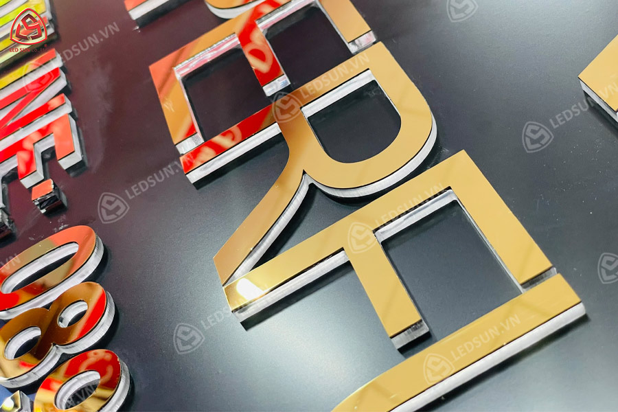 Chữ inox vàng gương chân mica trong là một loại chữ nổi thường được sử dụng trong các biển hiệu cao cấp cho cửa hàng, showroom, spa hay nhà hàng. Phần mặt chữ được làm từ inox vàng gương – loại inox có bề mặt sáng bóng như gương, mang đến cảm giác sang trọng và hiện đại. Chân chữ được tạo từ mica trong suốt, giúp nâng phần inox lên tạo hiệu ứng nổi 3D rõ rệt. Khi kết hợp thêm hệ thống đèn LED, ánh sáng sẽ hắt ra từ phần chân mica, tạo nên hiệu ứng chiếu sáng đẹp mắt, đặc biệt nổi bật vào ban đêm. Với độ bền cao, không gỉ sét, khả năng sử dụng tốt cả trong nhà lẫn ngoài trời, chữ inox vàng gương chân mica trong đang là lựa chọn lý tưởng cho những ai muốn nâng tầm nhận diện thương hiệu một cách chuyên nghiệp và đẳng cấp.